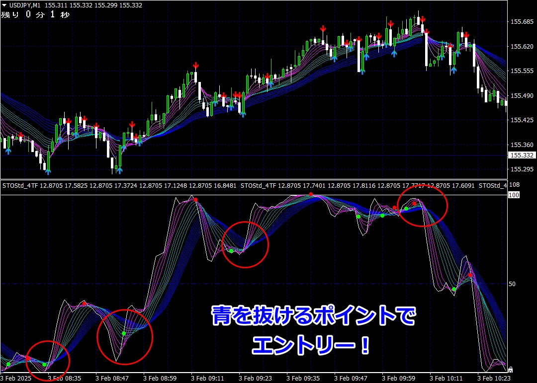 ② 矢印サイン点灯状態で、インジケーターのピンク色の帯が、緑の帯を下からすくい上げるような形状であれば、現在のローソク足が確定する数秒前か確定の直後に1分判定または3分判定でハイエントリーします。
