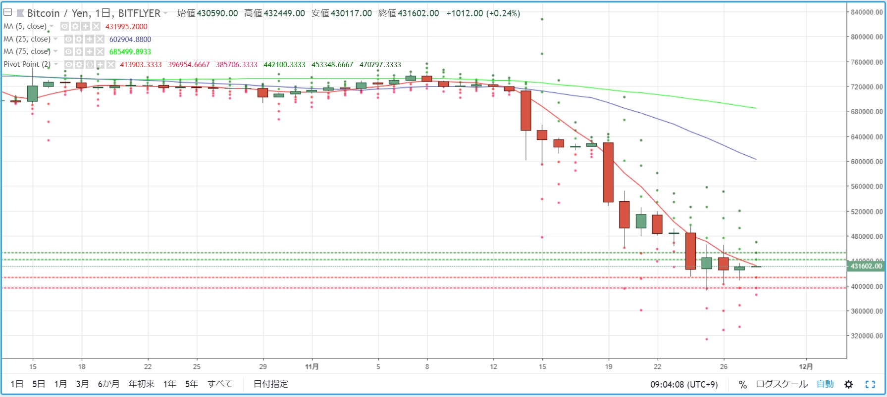 画像は2018年11月29日のキャプチャ。「真紅」に染まる暴落が立て続けに起こっていたここ2週間ですが、久しぶりの「濃緑」で回復しています。ビットコイン、ビットコインキャッシュ、リップル、イーサリアムは、6~11%の回復を見せています。