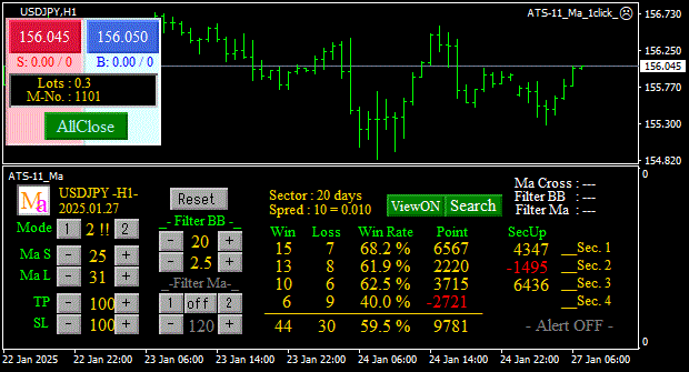 一方で、設定1(USDJPY H1)は、勝率66.7%と比較的良好な成績を示したものの、収益面では若干のマイナスとなりました。取引回数が少ないことも影響している可能性がありますが、設定自体の有効性は確認できます。