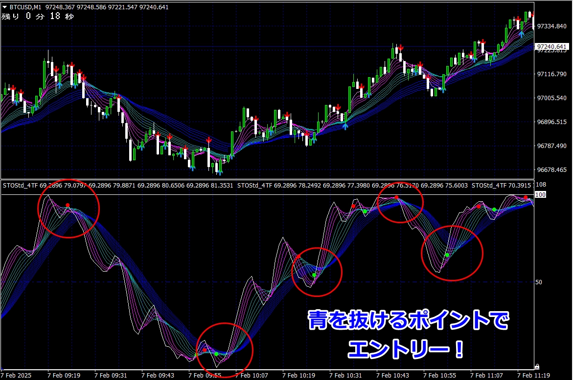② 矢印サイン点灯状態で、インジケーターのピンク色の帯が、緑の帯を下からすくい上げるような形状であれば、現在のローソク足が確定する数秒前か確定の直後に1分判定または3分判定でハイエントリーします。