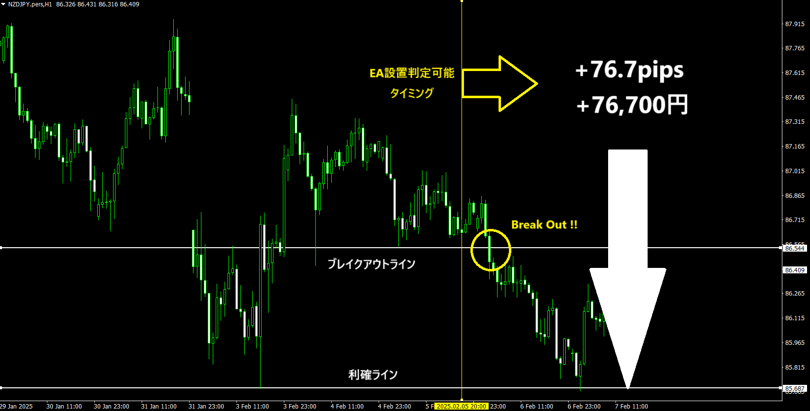 ※その後1時間足でレジサポラインにてブレイクアウトが発生しているように見えますが、価格は伸びず、最安値にタッチすることなく高値を切り上げていきました。この時のブレイクアウトでは手法によるEA設置判定はでていません。