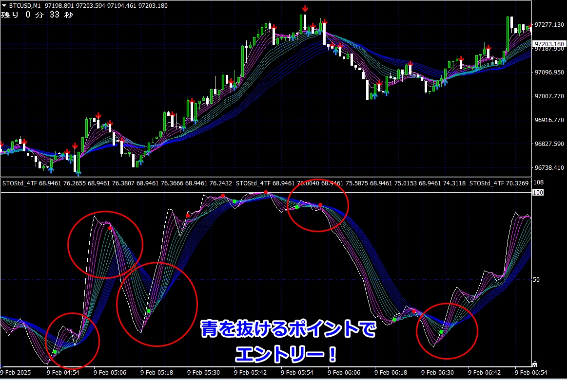 ※ サイン点灯=エントリーではありませんので、インジケーターが緑帯をすくい上げるような形状でない場合は、エントリーしません(サイン点灯でエントリーできる頻度は、数回に1度くらいです)。
