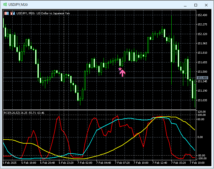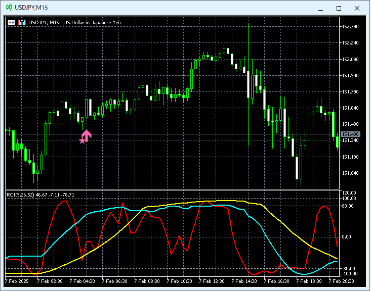 米雇用統計発表前までの上昇時におけるmBDSR(RCI2本フィルター)の押し目買いサイン。12分足→15分足→20分足の順番でサインが点灯して上昇している。