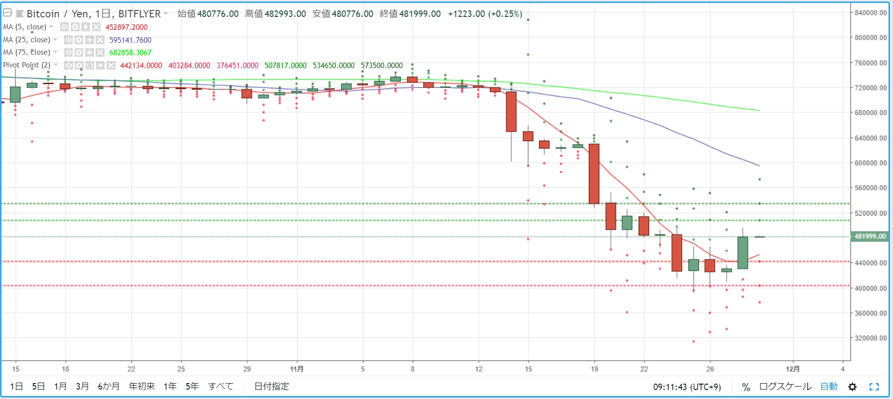 画像は2018年11月30日のキャプチャ。暴落が起こった後に、「濃緑」で回復した昨日の流れを受け、今日は「緑」「赤」が半々の環境です。主要どころでは、ビットコインは「緑」に踏みとどまるも、ビットコインキャッシュ、リップル、イーサリアム、ライトコインは「赤」となっています。