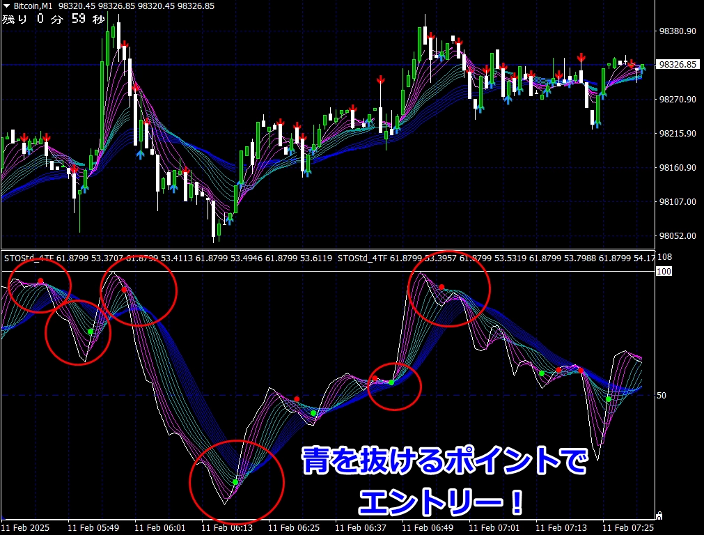 ② 矢印サイン点灯状態で、インジケーターのピンク色の帯が、緑の帯を下からすくい上げるような形状であれば、現在のローソク足が確定する数秒前か確定の直後に1分判定または3分判定でハイエントリーします。