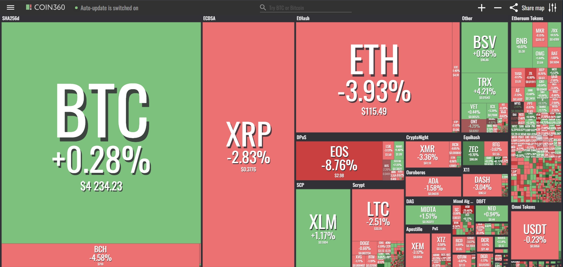 coinmarketcap(コインマーケットキャップ)のサイトから、ドミナンス(各銘柄が仮想通貨全体の時価総額に占めるパーセンテージ)を定点観測していきます。仮想通貨全般が下方向に大きく動き出している相場状況を受け、毎日更新することとし、仮想通貨業界を俯瞰および転換期を早期に発見することを目的とします。