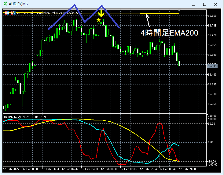 上の6分足を見ると、4時間足EMA200付近でダブルトップを形成して下げている。mBDSR(RCI2本フィルター)の戻り売りサインがダブルトップの右側の山における下げ開始のタイミングを上手くとらえていることが分かる。