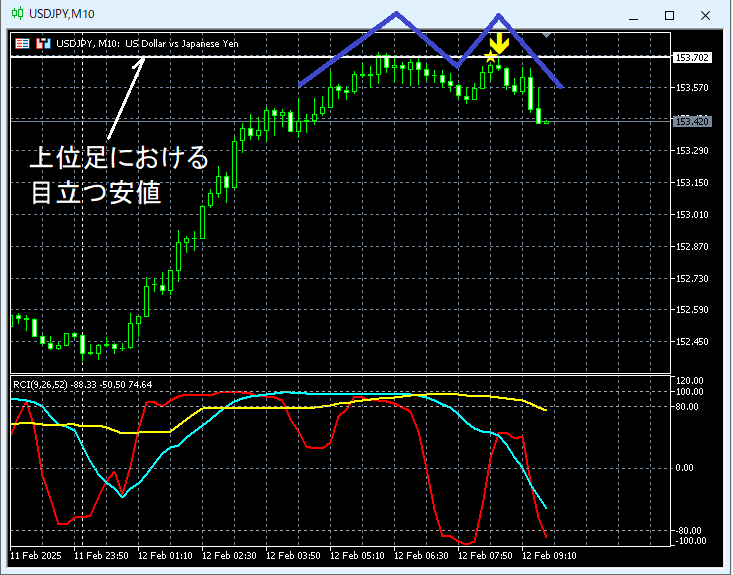 【MT5版】上位足における目立つ安値とダブルトップとmBDSR(RCI2本フィルター)の戻り売りサイン