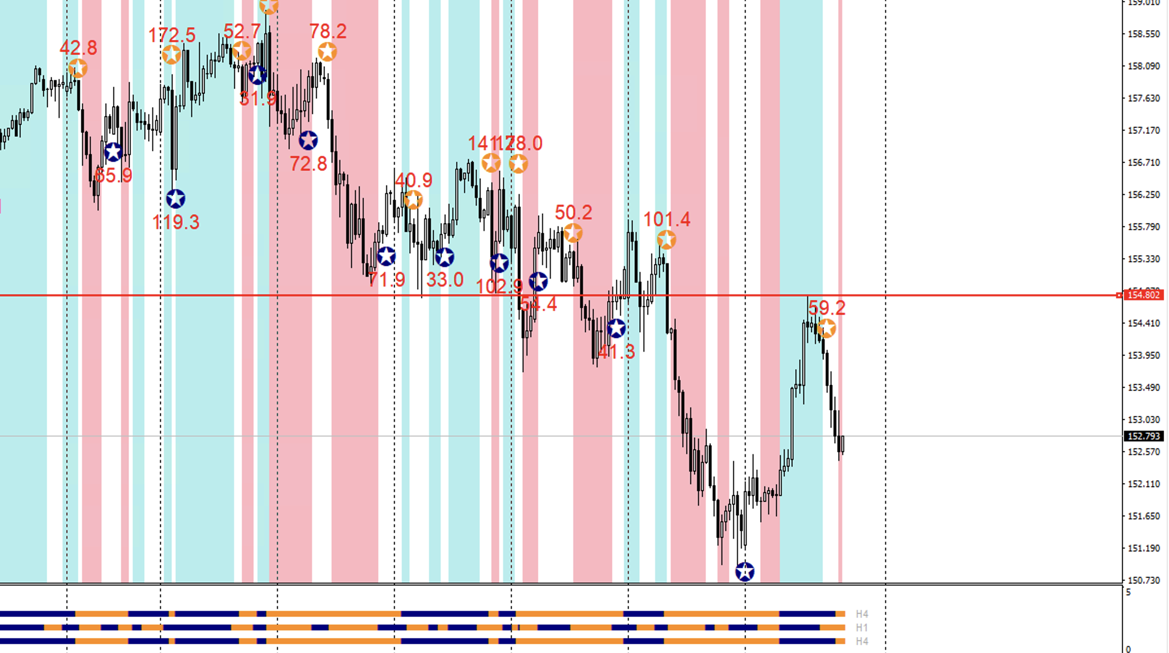 4時間足でチャートを見ると、154.8までの戻り目から、再下降となっています。