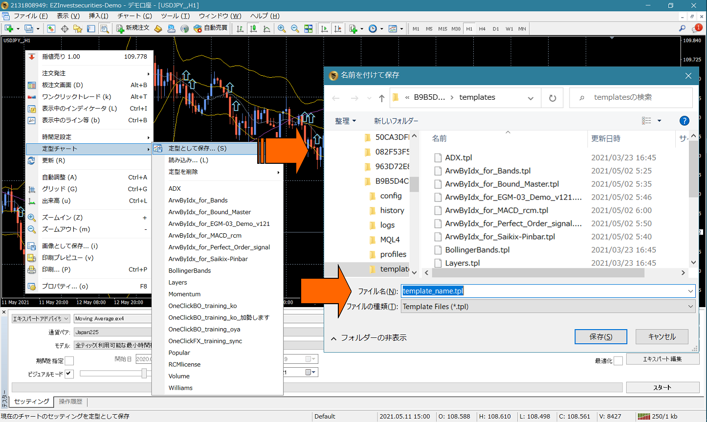※ワンクリックFX/225トレーニングのバージョン6以降、またはワンクリックBOトレーニングはテスタースタート後でも定型チャートを変更できますので、開いたファイルと同じ名前で保存する必要はございません。