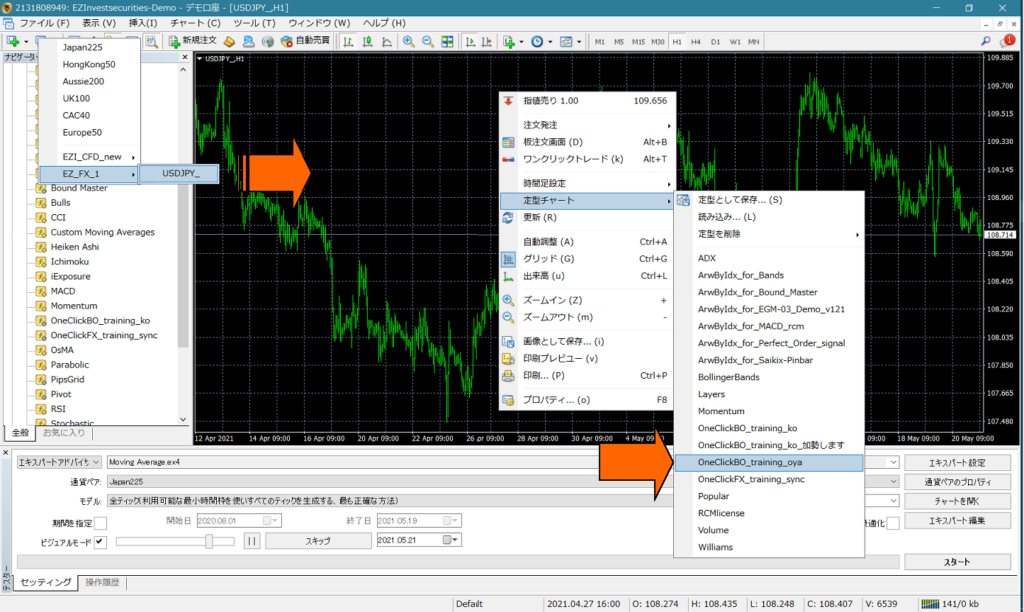 4.テスターで稼働させるトレーニング系の場合は、スタートボタンを押しますと変更された定型チャートが表示されます。通常チャートで表示するツールの場合は、右クリック=>定型チャートで保存したファイル名を選択してください。