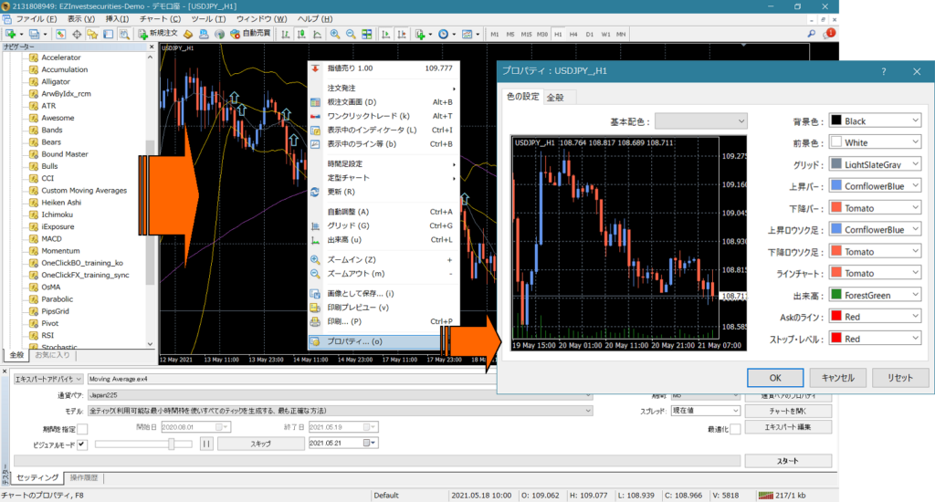 2.開いたチャートにインディケーターを追加したり、右クリック=>プロパティから、チャートの背景やバーの色を変更します。