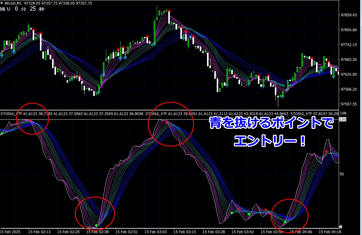 ※ サイン点灯=エントリーではありませんので、インジケーターが緑帯をすくい上げるような形状でない場合は、エントリーしません(サイン点灯でエントリーできる頻度は、数回に1度くらいです)。