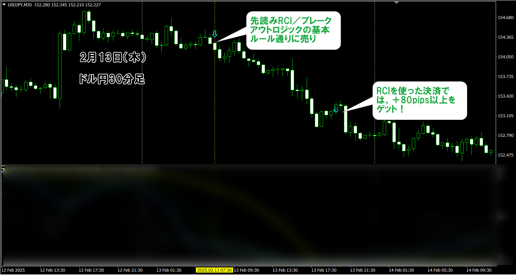 利食い値幅は採用する決済方法によって異なってきますが、このトレードではRCIを使った決済で+80pips以上取れています。