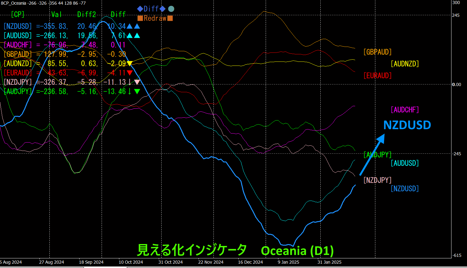 下の図は、「8CP見える化インジケータ」Oceania版を日足で表示したものです。