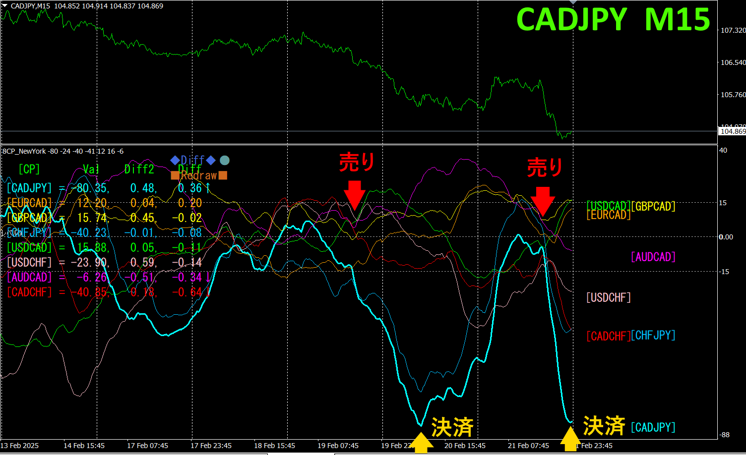 上半分は、CADJPYの15分足チャートです。下半分は、「8CP見える化インジータ」によるものです、水色太線のグラフがCADJPYに相当します。