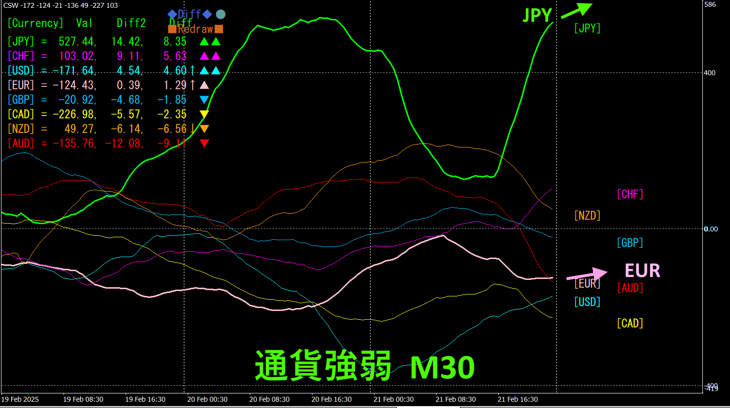 ピンク色がEUR、緑色がJPYです。通貨強弱チャートでは、JPYがやや上向きに、EURがやや下向きになっているので、今後のEURJPYは、やや下落の方向に進むものと考えられます。