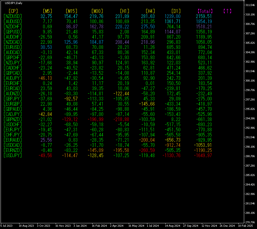 [Total]数値の降順に並んでいます。一番上にあるNZDUSDは、全ての時間足で青色系の表示色になっています。Total数値が 2159.51と、大きなプラスの数字になっています。NZDUSDに上昇トレンドが発生していることが示唆されれます。