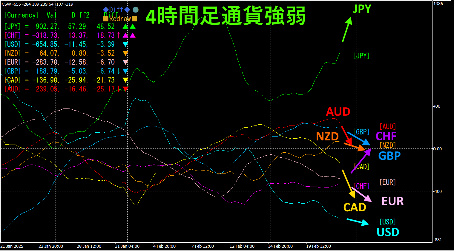 4時間足では、JPY、CHFが上向き、AUD、CAD、GBP、EUR、NZD、USDが下向きになっています。