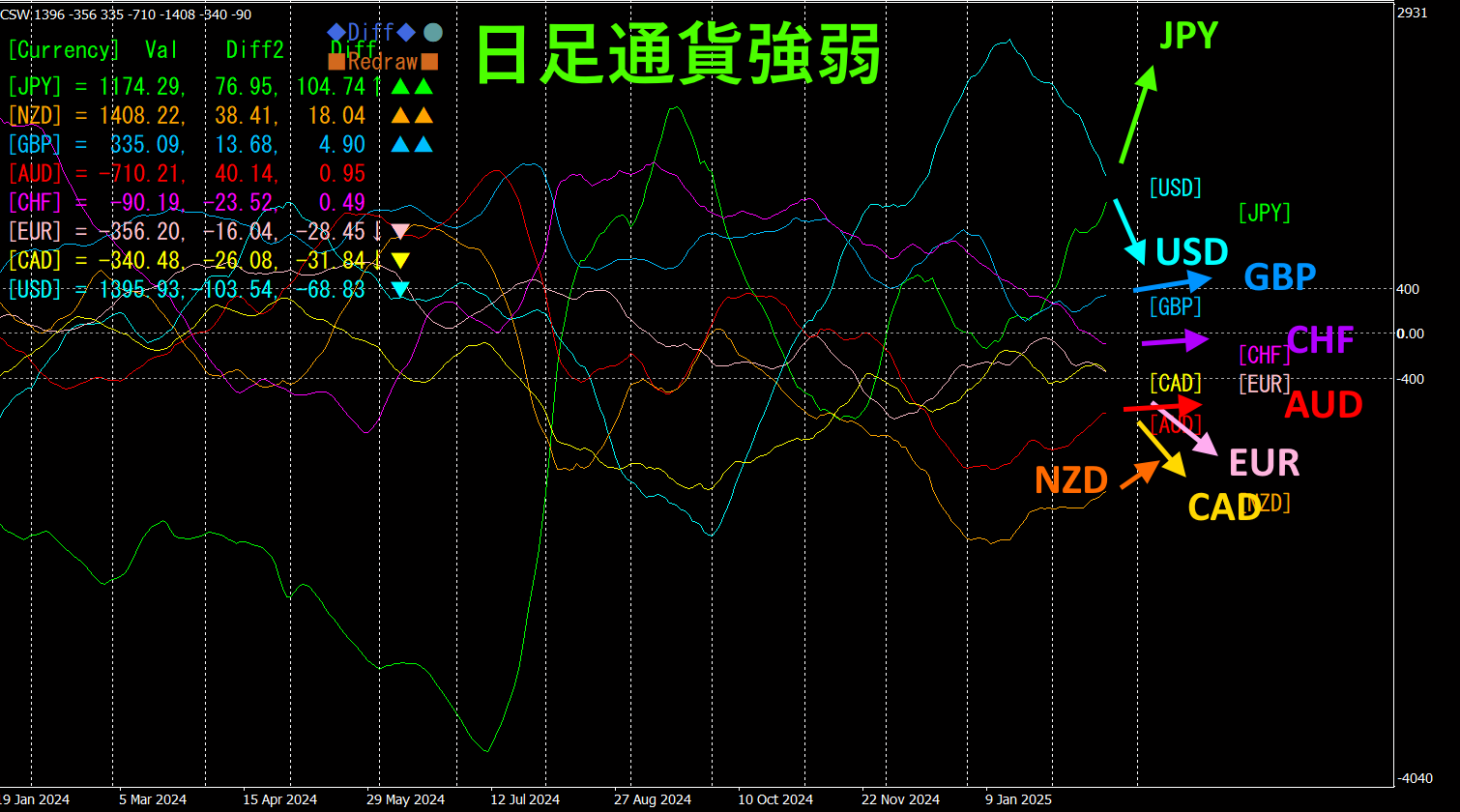 JPY、NZD、GBPが上向きです。一方、USD、CAD、EURが下向きに、AUD、CHFはほぼ水平になっています。日足通貨強弱チャートでは、JPYの急角度な上昇とUSDの急下降が目立っています。