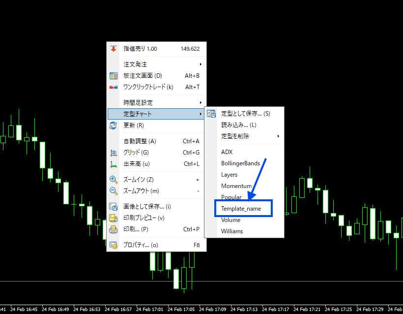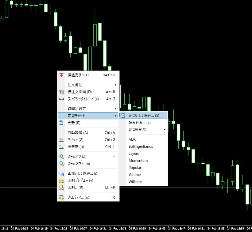 1.チャート上で右クリックします→定型チャートの上にマウスを置いて→【定型として保存】を選択する