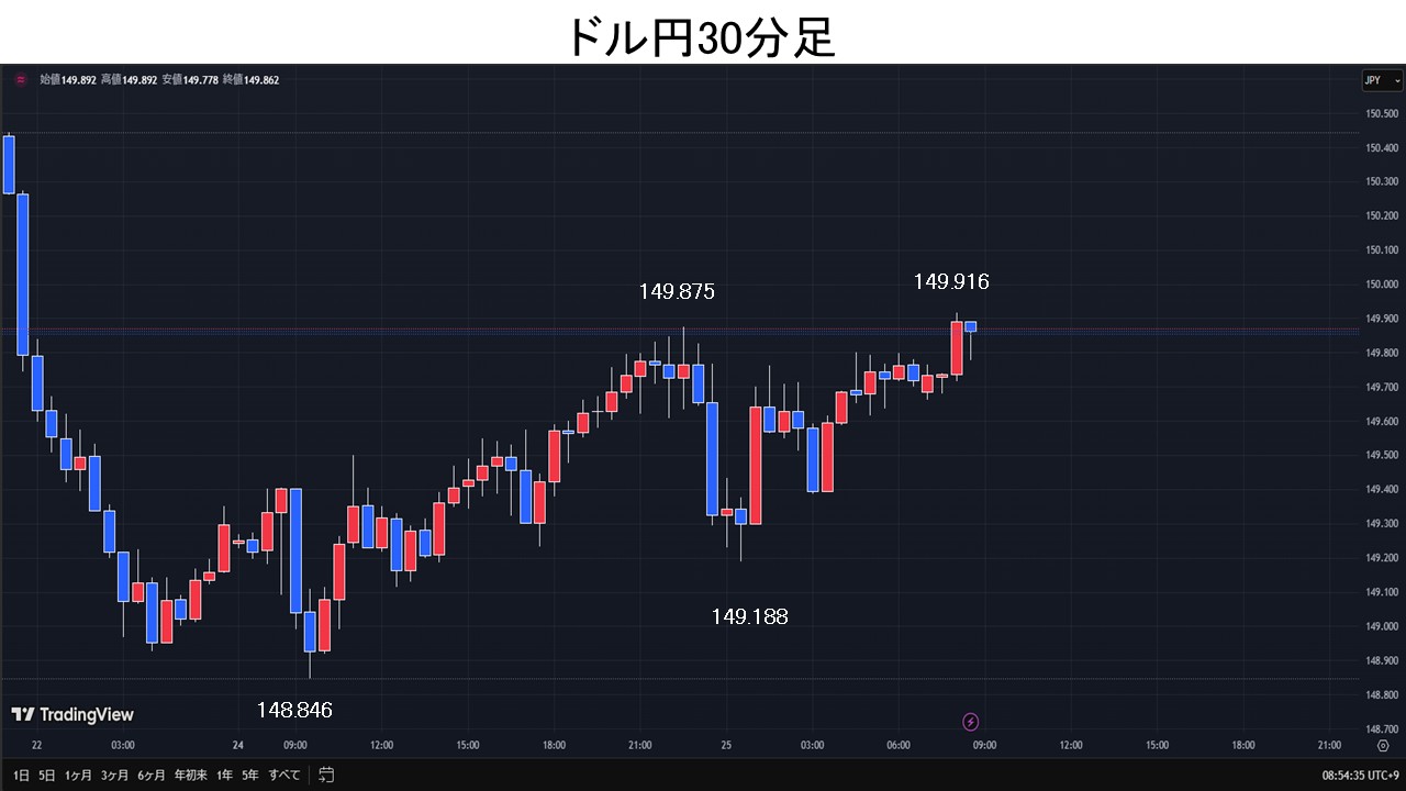 日本が天皇誕生日の振替休日で休場の中、ドル円は東京時間に一時148.84円と昨年12/3以来の安値を付けた。その後、同日安値148.63円がサポートされると、買い戻しが先行。欧州時間、独DAXが高く始まると円売り・ドル買いが先行。時間外のNYダウ先物の上昇などもあり、ドル円は149.87円まで上昇。NY時間、高く始まった米国株が下げに転じると一時ドル円は149.18円まで下押しとなったが、その後は149.91円まで買い戻された。