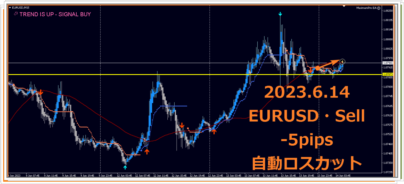 ①Sellエントリー後、微損のうちにEAによって素早く自動損切り(-5pips)した事によって
