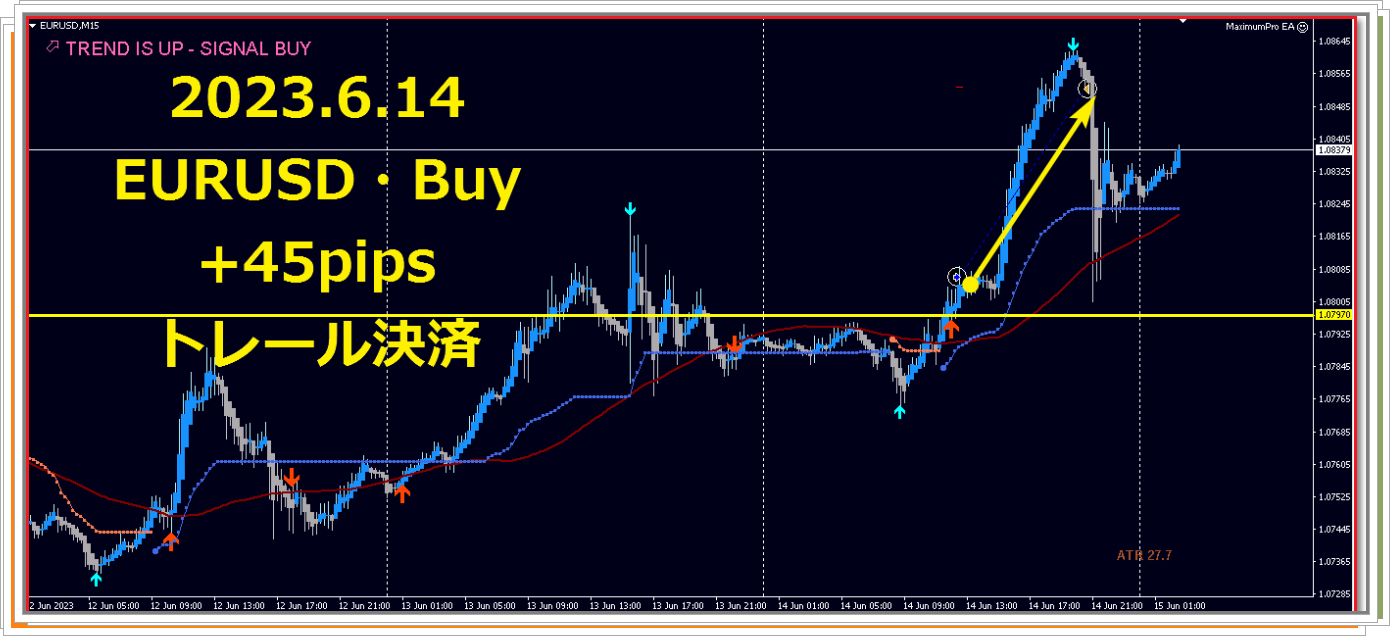 ②おかげで次のチャンス、"TrendStream"からのシグナル配信された上昇トレンド(+45pips)をものにするできました。