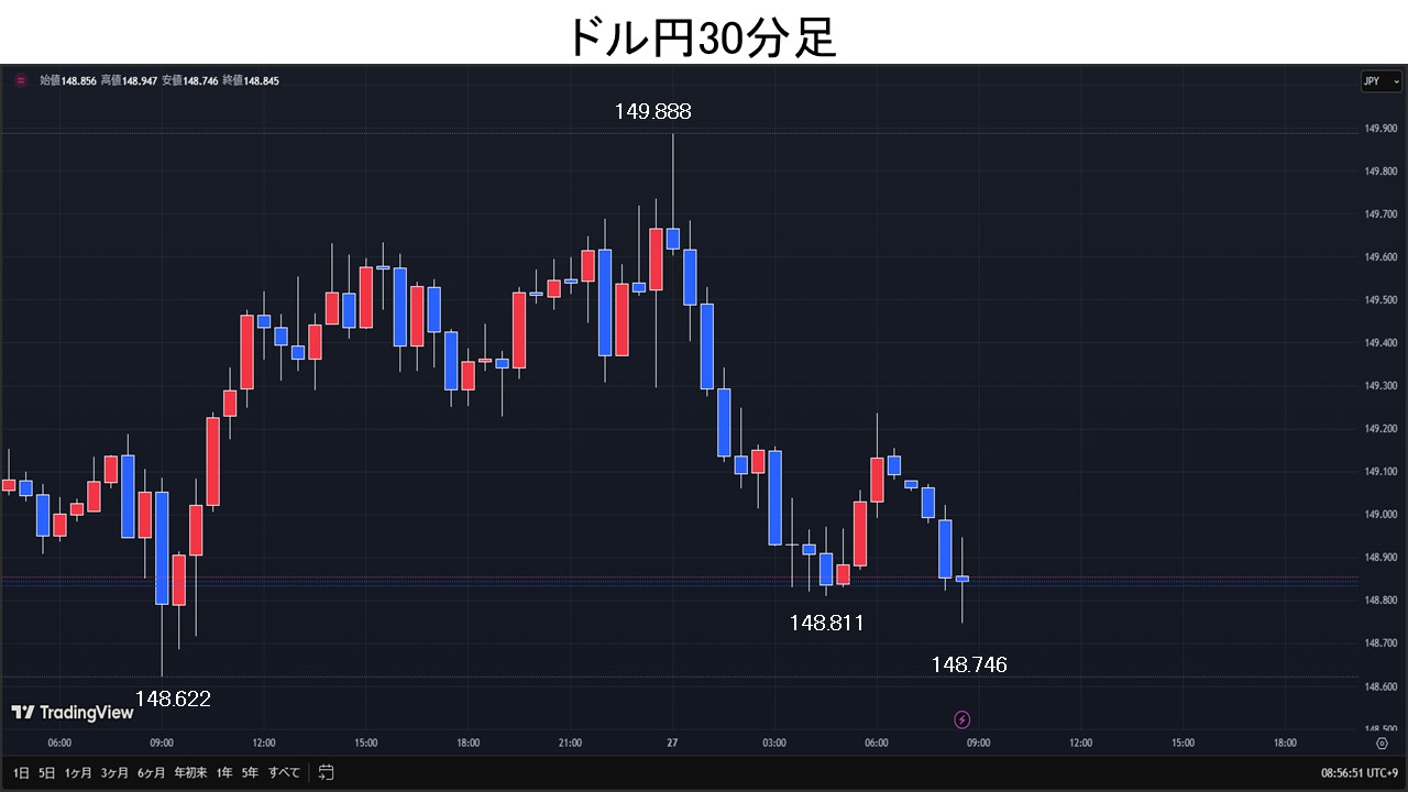 東京時間、ドル円は朝方148.62円まで下落となるが、その後は時間外の米10年債利回り上昇などを受け149.63円まで上昇。欧州時間、ドル円は一時149.88円まで上昇となるが、150円手前で失速。NY時間、ロンドン・フィキシングに絡んだドル売り観測や、EUに対するトランプ関税を嫌気した米国株下落などを受け、ドル円は一時148.81円まで下落。その後は149円台前半まで買い戻された。