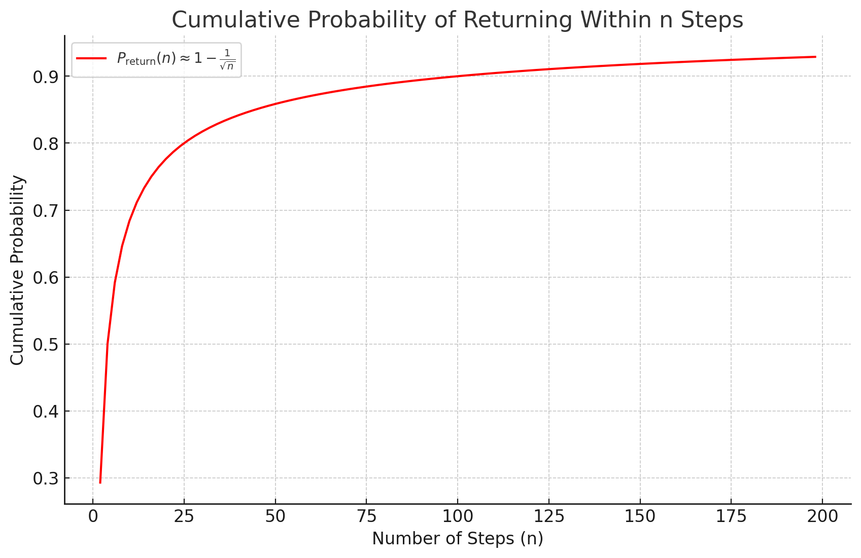 1次元のランダムウォークでは、無限の時間があれば初期位置に戻る確率は 1 である。lim n → ∞ P return ( n ) = 1