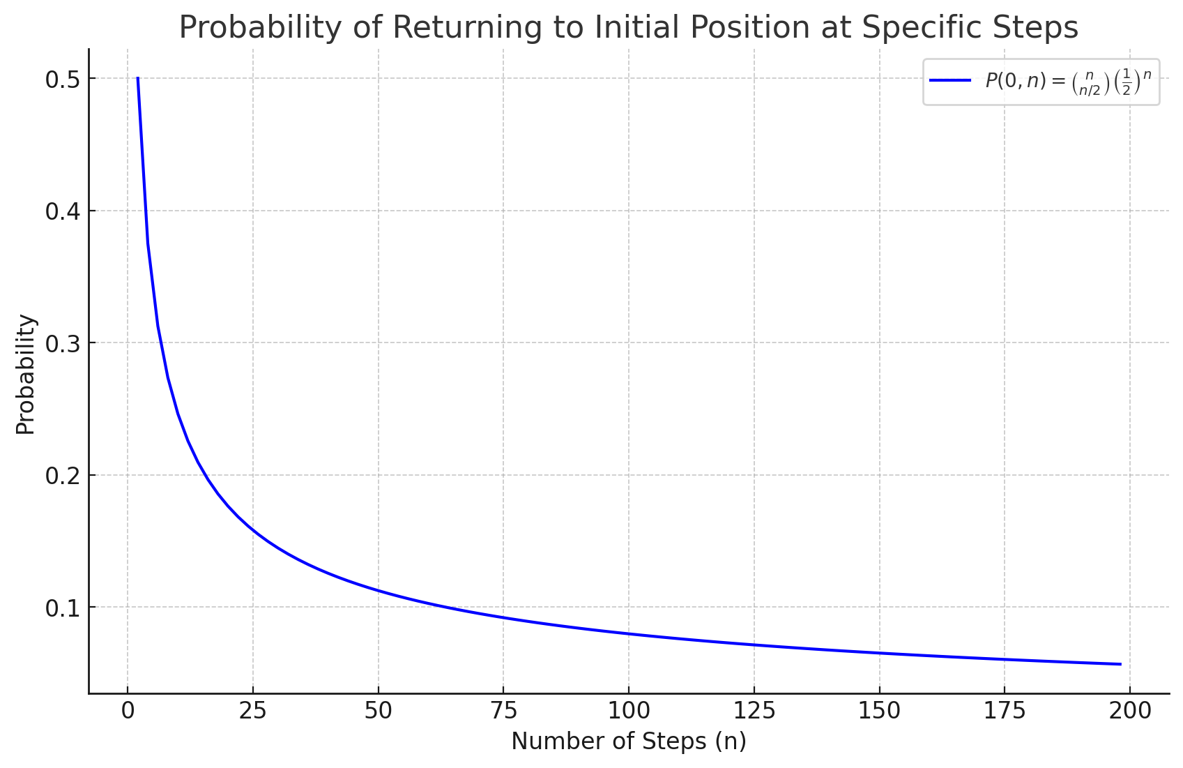 - しかし、特定のステップで元の位置に戻る確率は、時間が経つにつれて急激に低下する。