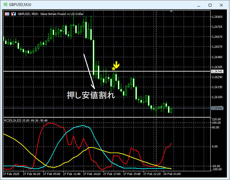 【MT5版】押し安値割れとmBDSR(RCI2本フィルター)の戻り売りサイン 昨夜(2025年2月27日)のポンドドル