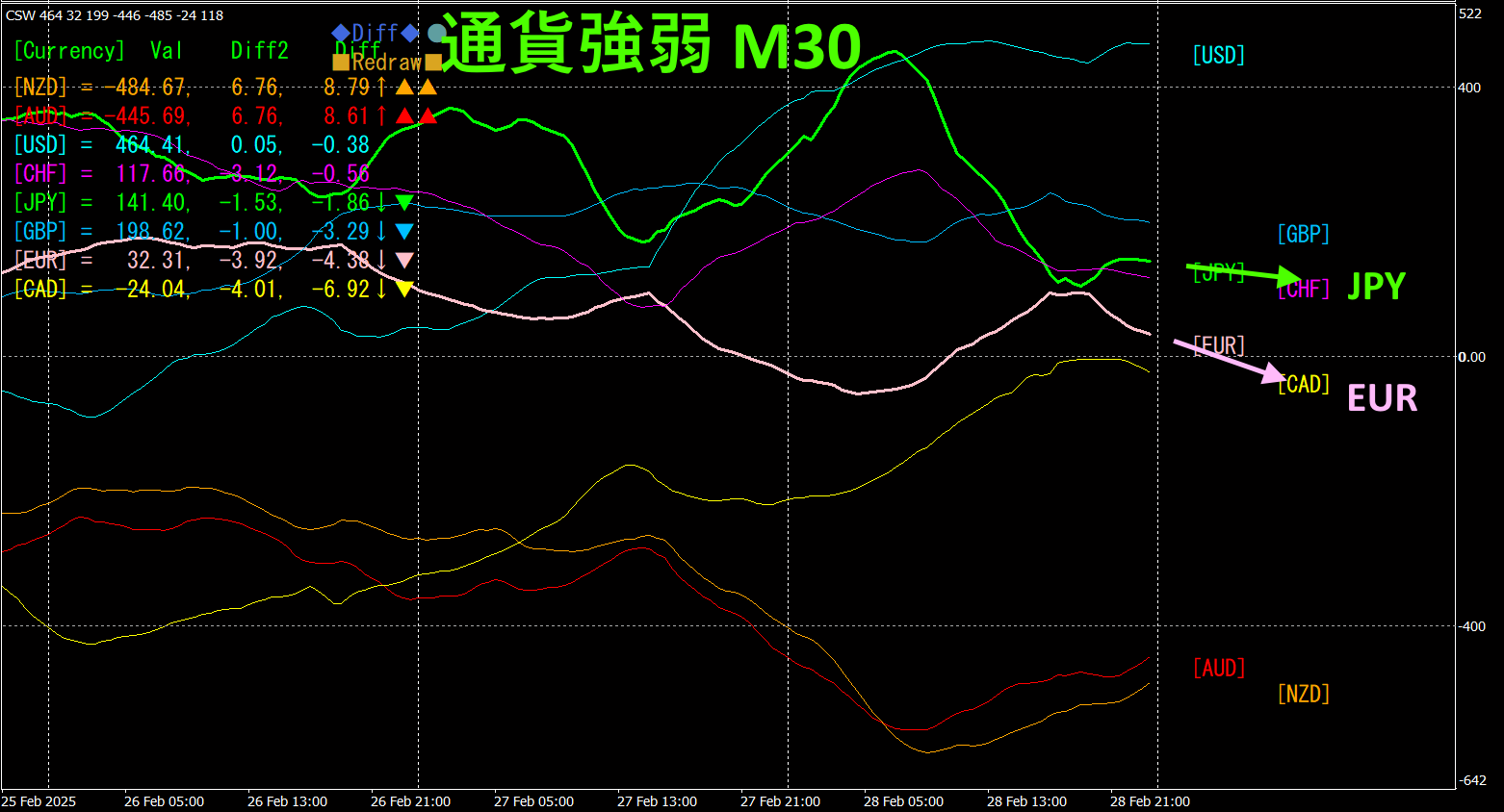 ピンク色がEUR、緑色がJPYです。通貨強弱チャートでは、JPYもEURもどちらも上向きになっていますが、JPYの角度が上向きなので、今後もEURJPYは、下落が進むものと考えられます。ただ、JPYの通貨強弱チャートが上限で頭を打って反転すれば、EURJPYは上昇してくるでしょう。