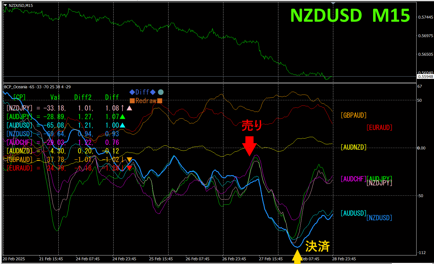 上半分は、NZDUSDの15分足チャートです。下半分は、「8CP見える化インジータ」によるものです、水色太線のグラフがNZDUSDに相当します。