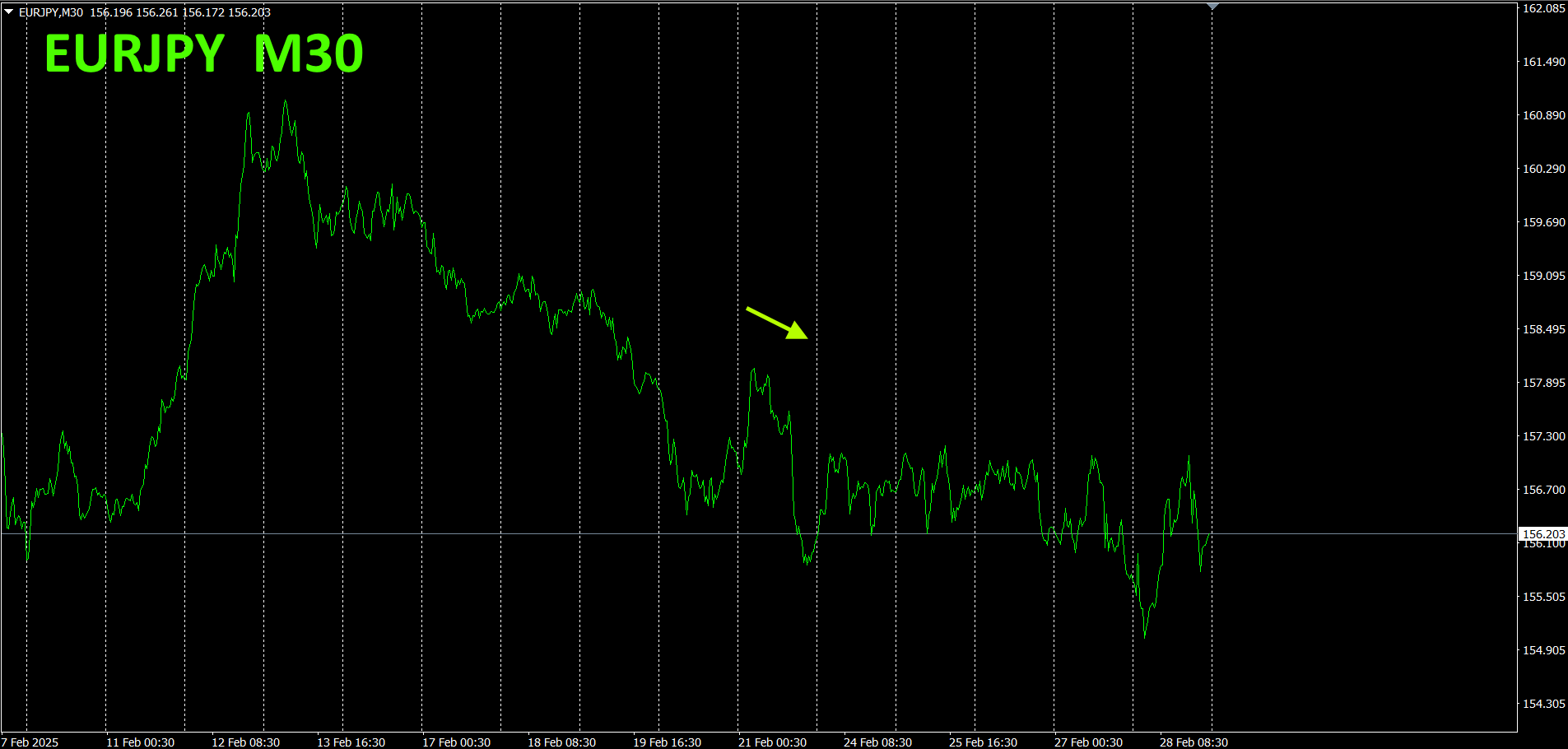 ピンク色がEUR、緑色がJPYです。通貨強弱チャートでは、JPYもEURもどちらも下向きになっていますが、JPYの角度よりEURの方がより下向きなので、今後もEURJPYは下落方向に進んで行くと考えられます。