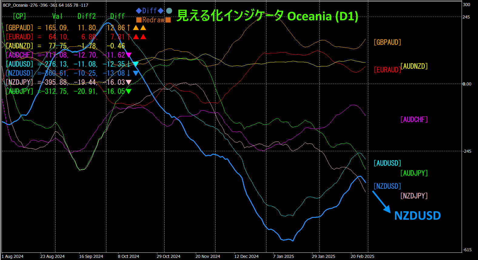 下の図は、「8CP見える化インジケータ」Oceania版を日足で表示したものです。