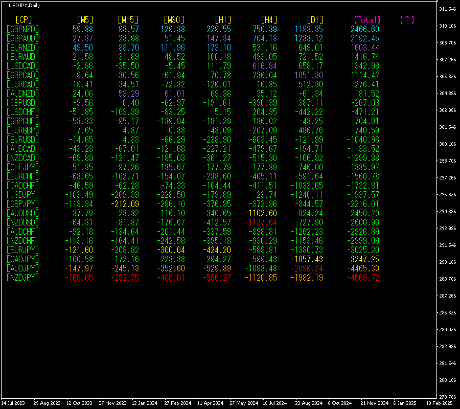 [Total]数値の降順に並んでいます。一番下にあるNZDJPYは、全ての時間足で赤色系の表示色になっています。Total数値が -4569.72と、大きなマイナスの数字になっています。NZDJPYに下降トレンドが発生していることが示唆されれます。