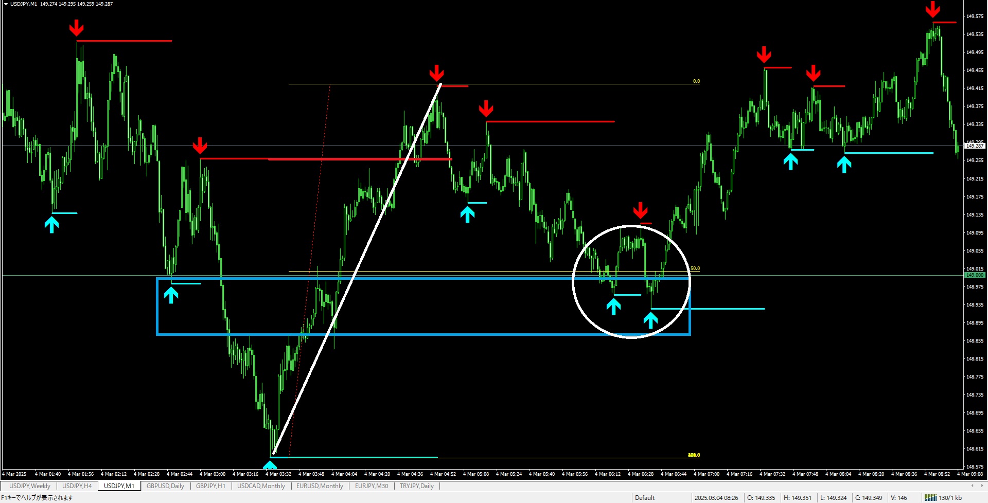 チャートを見れば一目瞭然で説明の必要ないと思いますが、4時間足レベルのレンジ(149~151円)下限でトレンド転換を見せたので、それをトリガーに押し目買い。