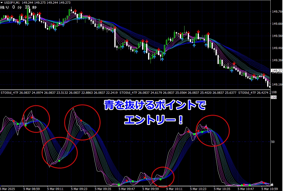 ※ サイン点灯=エントリーではありませんので、インジケーターが緑帯をすくい上げるような形状でない場合は、エントリーしません(サイン点灯でエントリーできる頻度は、数回に1度くらいです)。