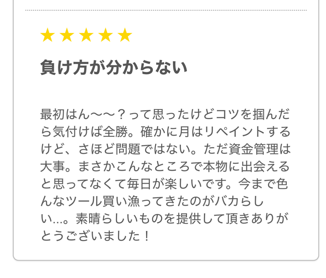 コツを掴んで全勝とはお見事です。リペイントについても冷静に捉え、資金管理の重要性を理解されているのはさすがです。