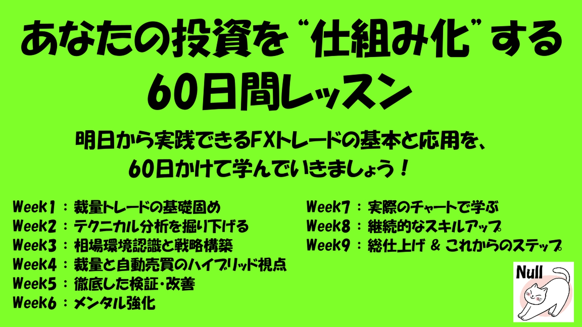 - WEEK 8の大きなテーマ:年間目標やリスク管理の最終仕組みを固め、勝ち負けのブレを長期視点で吸収する体制を作る。