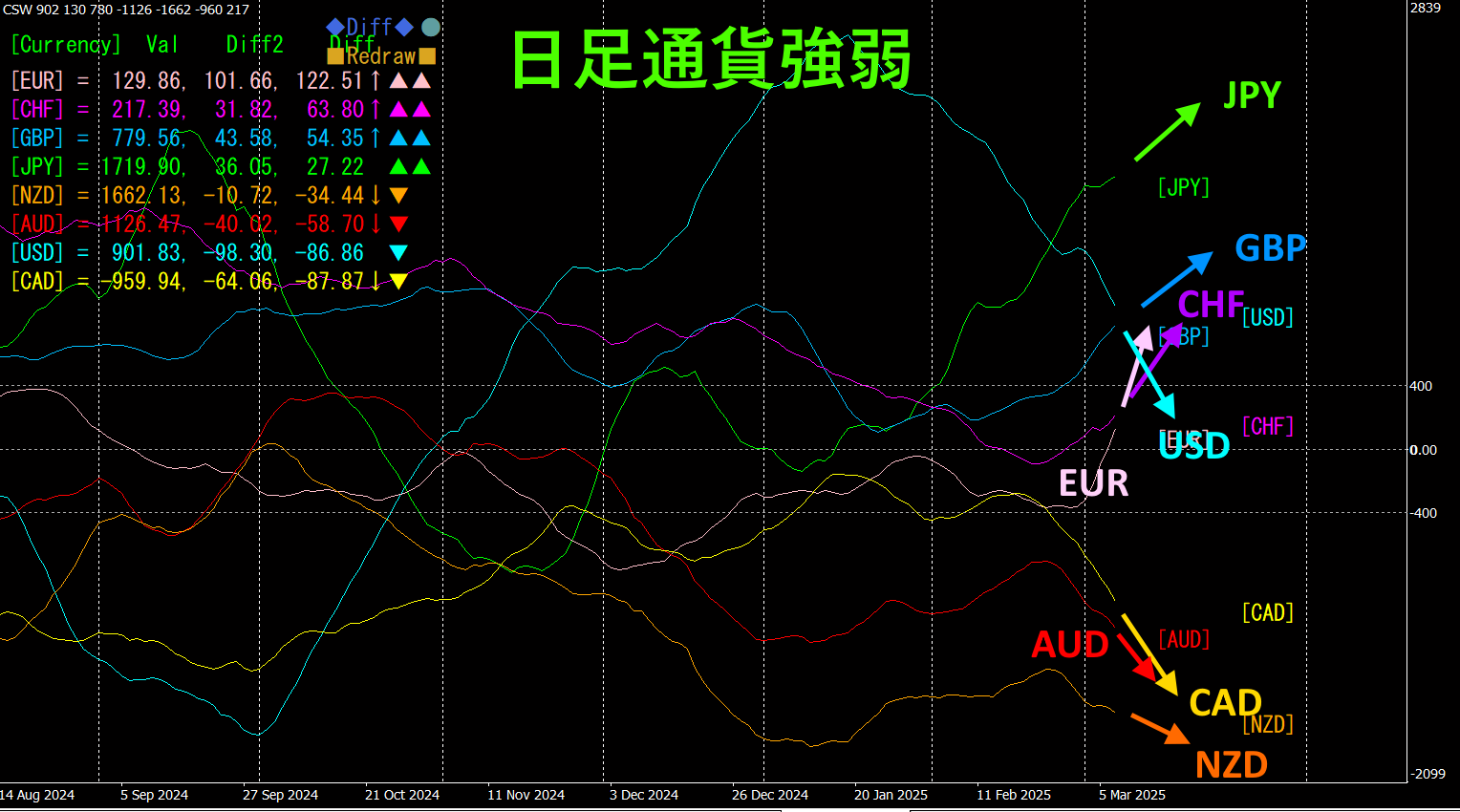 EUR、CHF、GBP、JPYが上向きです。一方、CAD、USD、AUD、NZDが下向きになっています。日足通貨強弱チャートでは、EURの急角度な上昇とCADの下降が目立っています。