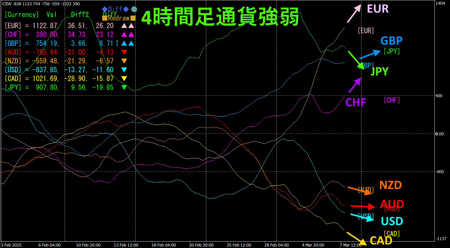 4時間足では、EUR、CHF、GBPが上向き、JPY、CAD、USD、NZD、AUDが下向きになっています。