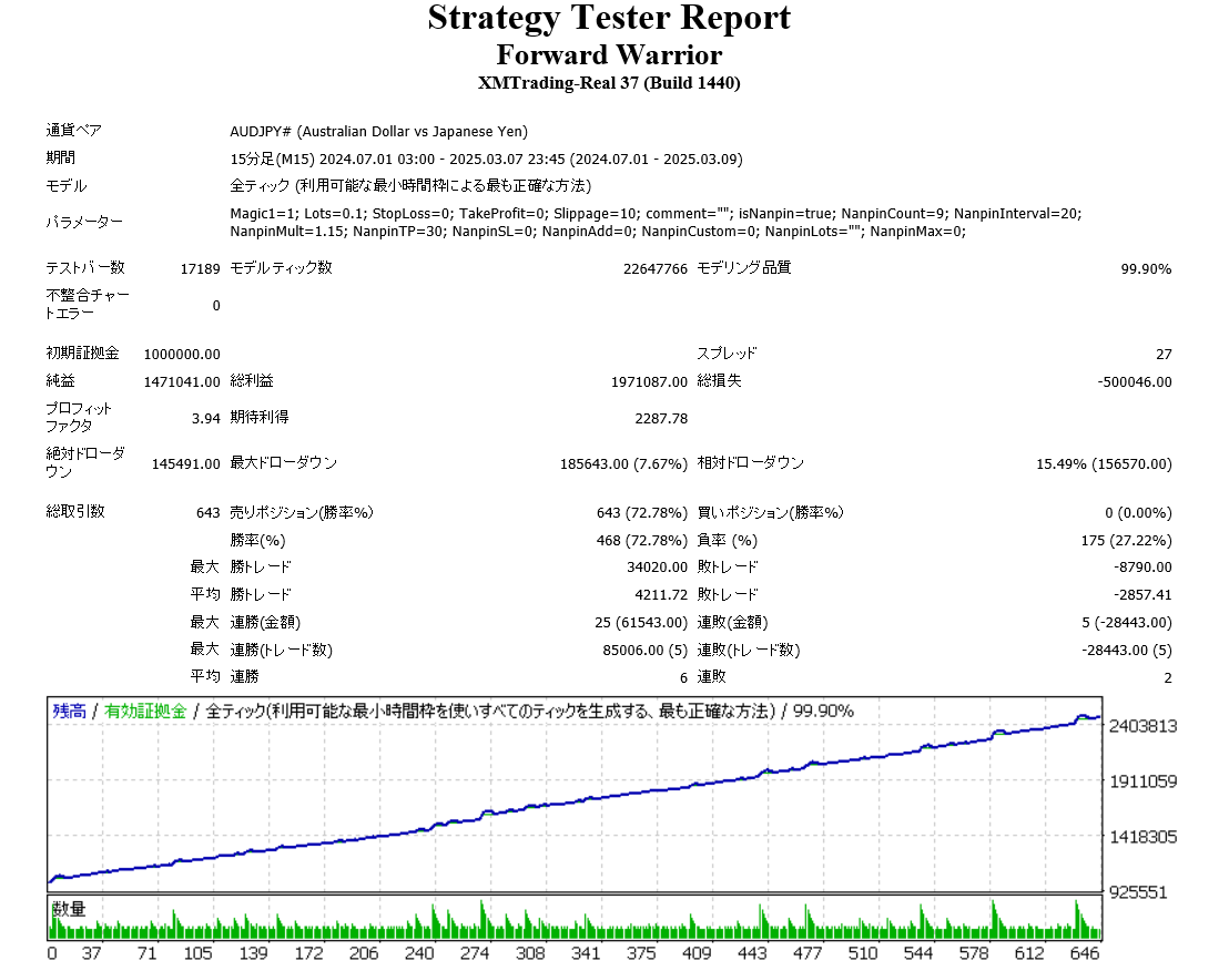 *『Forward Warrior』バックテストではEAに指定額の含み損が発生したら決済を行うよう、テスト用に「含み損テストロジック」を組み込みました(テスト用のため製品には組み込んでいません)。