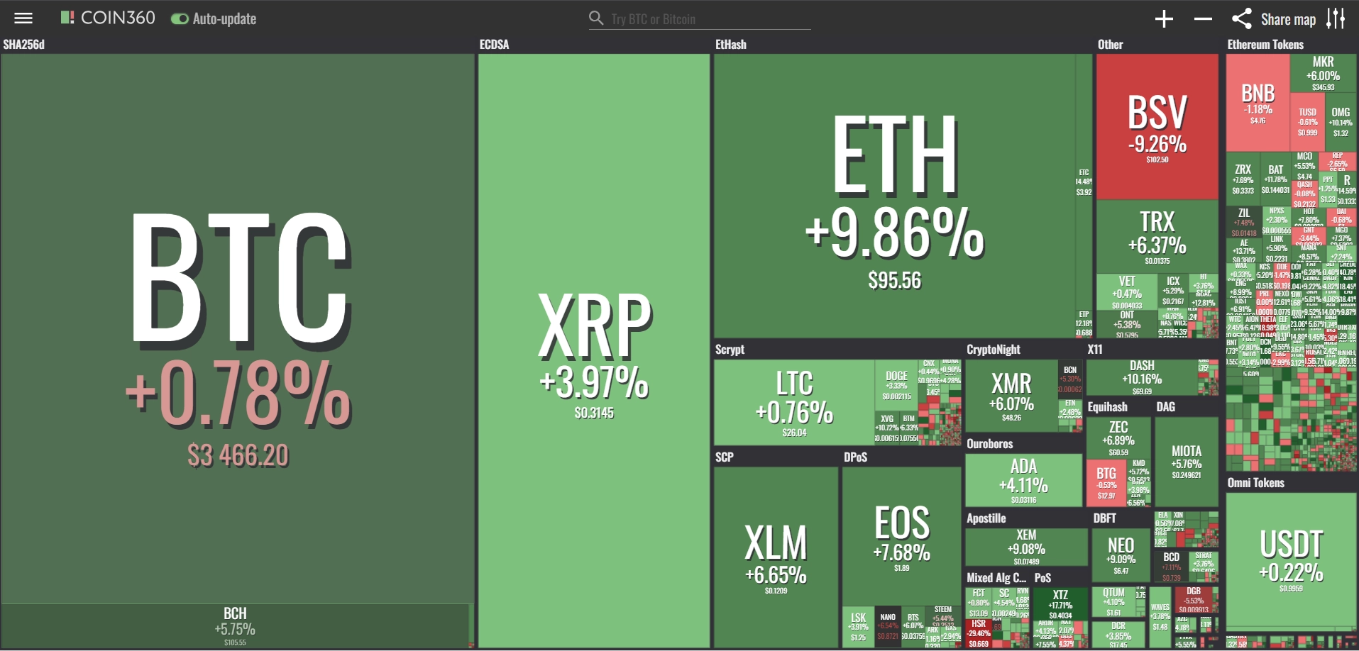 COIN360°(https://coin360.io/)は、仮想通貨やトークンの24時間の変動率や時価総額を一覧できるサイト。緑色はプラス変動、赤色はマイナス変動を示し、その色が濃いほど変動の度合いも大きくなります。また、各仮想通貨の面積は、時価総額の大きさを示します。