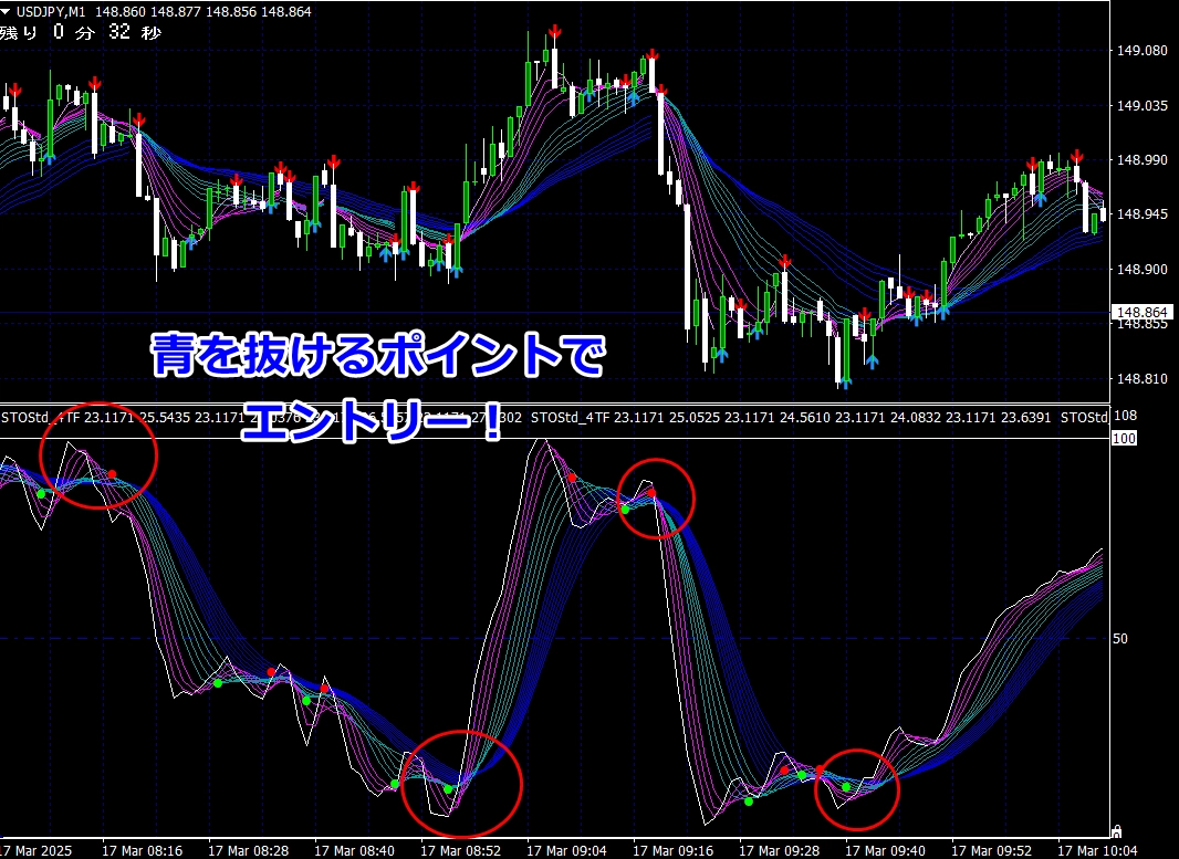 ② 矢印サイン点灯状態で、インジケーターのピンク色の帯が、緑の帯を下からすくい上げるような形状であれば、現在のローソク足が確定する数秒前か確定の直後に1分判定または3分判定でハイエントリーします。