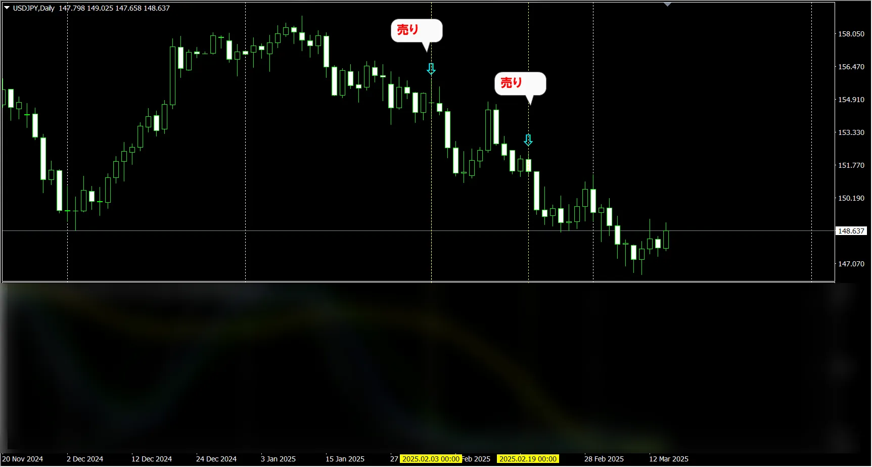 1月からここまでの下落局面で2回の売りサイン条件に合致した足があり、どちらも快勝になっていることが分かります。