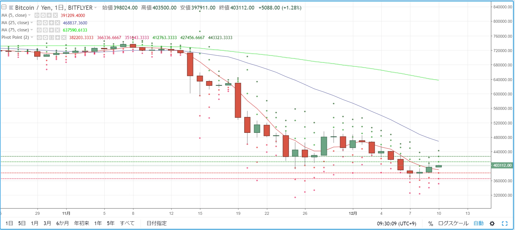 画像は2018年12月10日のキャプチャ。ここ最近は、下げては調整の戻りを見せ、また下げるといったサイクルが繰り返されています。昨日は下げの本流が再加速した日でしたが、今日はその調整的な戻りとして、全面的に「緑」が目立つ相場環境となっています。