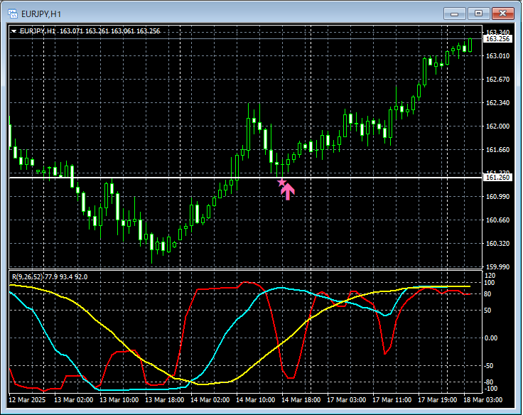 上の1時間足を見ると、目立つ高値付近まで下げてきたところでmBDSR(RCI2本フィルター)の押し目買いサインが点灯して、その直後からプライスはしっかり上昇している。
