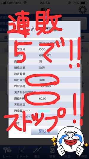 → 利食いは60pips、損切りは50pipsでOCOでセット